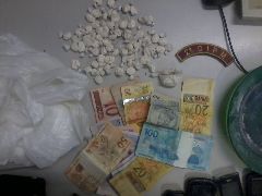 Ao ser feita buscas no interior da residência foi, encontrando sobre a mesa da cozinha 61 trouxas de substância análoga a cocaína, o prato com a colher com a mesma substância, varios celulares, cerca de R$ 266,00 em dinheiro, uma máquina fotográfica, várias sacolas recortadas, o carretel de linha na cor marrom e a tesoura.