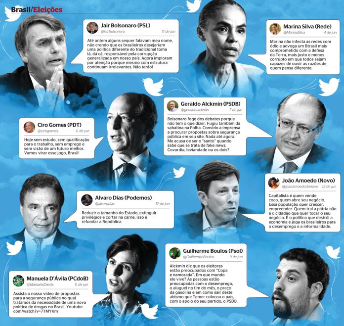 Nas últimas semanas, Meirelles e Ciro têm apostado em vídeos bem produzidos, como se fossem inserções de televisão. João Amoêdo (Novo) é outro habituê das redes. Já tem um milhão de curtidas no Facebook e costuma interagir com os usuários. “É divulgando as nossas ideias, contando o que a gente tem feito e apresentando propostas. Tudo isso usando a tecnologia. O país tem cerca de 120 milhões de brasileiros com acesso ao WhatsApp. O Novo terá cerca de 370 candidatos a deputado federal. Vai ser com esse grupo, com a quantidade de voluntários do Novo fazendo a divulgação, que a gente quer atingir esse público”, disse. Guilherme Boulos (PSOL) é, segundo seus adversários, o típico socialista de iphone. Não abre mão das criações do capitalismo, embora o renegue. Segundo a AJA Solutions, uma agência britânica de comunicação e marketing especializada em Brasil, ele “consegue manter níveis de visibilidade e relevância proporcionalmente altos no Twitter. Foi o pré-candidato que mais ganhou seguidores em maio”.