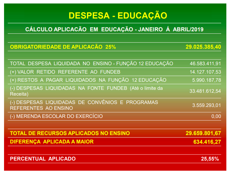 Além da Saúde que atingiu 21,23%, a Educação que tem previsão constitucional de até 25% das receitas públicas em Várzea Grande recebeu 25,55%. “Estes índices demonstram o compromisso da gestão da prefeita Lucimar Campos, pois ainda estávamos nos quatro primeiros meses do ano e já havíamos cumprido os percentuais que eram do ano inteiro”, disse a secretária de Gestão Fazendária, Lucinéia dos Santos Ribeiro.