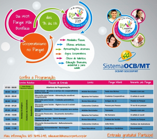 Cooperativas reúnem-se neste final de semana num evento em conjunto que mobiliza voluntários pela disseminação dos valores cooperativos nas comunidades – o “Dia C”, Dia de Cooperar. Uma oportunidade para transformar e ser transformado através de atividades voluntárias norteadoras e essenciais ao bem-estar comum. O evento na capital, que reúne 8 cooperativas, acontece neste sábado, dia 14 de setembro, das 7h às 11h, no Parque Mãe Bonifácia (entrada Miguel Sutil). A programação conta com atividades voltadas para temas como alimentação saudável, saúde preventiva, higiene bucal, educação financeira e sustentabilidade ambiental. Serão realizadas também, atividades lúdicas para todas as idades, oficinas de pipas, móbiles reciclados, cata-ventos criativos e bijuterias feitas com garrafas “pet”. “A expectativa é de recebermos mais de mil pessoas no parque, para que possamos trabalhar em conjunto os valores da cooperação. Toda comunidade de Cuiabá está convidada para participar conosco nesse grande evento de voluntariado e cooperativismo”, destacou o presidente do Sistema OCB-MT, Onofre Cezário de Souza Filho.