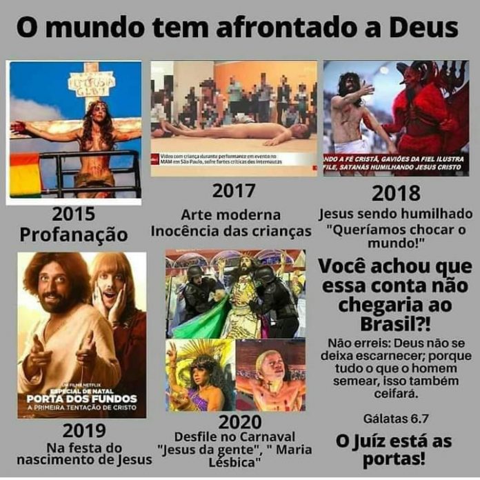 Em outra postagem do mesmo dia, uma montagem ganha destaque. Na imagem, várias representações artísticas, como Jesus no Carnaval, a performance de Viviany Beleboni – a transexual que interpretou Cristo na Parada LGBTQIA+ há alguns anos -, o Especial de Natal do Portal dos Fundos e entre outras, são listadas.