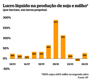 No caso dos produtores alavancados, a conta já ficou no vermelho – mas ainda assim a situação está bem melhor se comparada à safra 2023/2024, quando o prejuízo líquido por hectare foi de R$ 465 na soja e de R$ 577 no milho.