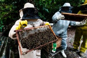 A imagem mostra o manejo de uma caixa de abelha, por quatro pessoas vestidas com equipamentos de proteção individual, em ambiente rural. A roupa é uma espécie de proteção que cobre todo o corpo e cabeça, de modo a evitar ferroadas de abelhas.