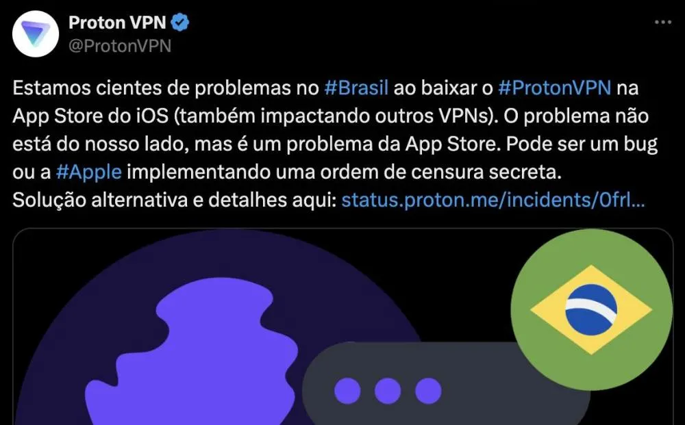 Usuários no Brasil estão enfrentando dificuldades para baixar o Proton VPN e outros serviços de VPN na App Store do iOS, levantando suspeitas de censura. A Proton VPN afirmou em sua conta no Twitter que o problema não está relacionado à empresa, mas sim a uma possível falha na App Store, ou talvez uma ordem de censura secreta.