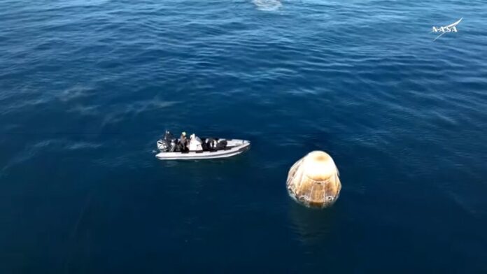 Após ser içada da água, a cápsula foi colocada na balsa de recuperação Megan, da SpaceX, para desembarque dos astronautas. Antes, eles passaram por exames médicos.