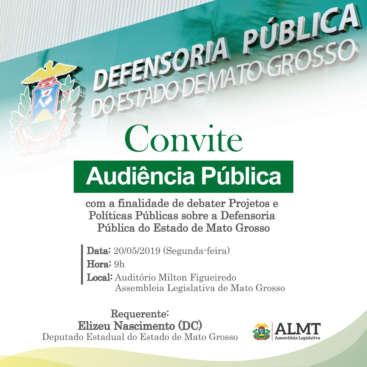 O evento faz alusão ao Dia do Defensor Público e da Defensoria Pública, que será celebrado neste domingo (19 de maio). A audiência foi solicitada pelo deputado Elizeu Nascimento (DC) no intuito de discutir projetos e ideias para melhorar a atuação dos defensores públicos de Mato Grosso. “Essa é uma oportunidade de debater os problemas atuais, captar ideias e colocar projetos em ação”, afirmou o deputado.
