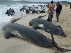 A mesma praia já havia testemunhado um grupo de 101 baleias-piloto presas no solo em 2007.