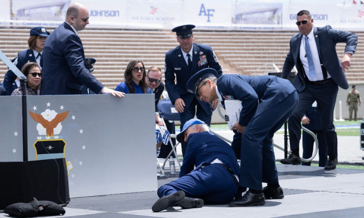 O presidente dos Estados Unidos, Joe Biden, de 80 anos, levou um tombo nesta quinta-feira, 1, durante uma cerimônia de entrega de diplomas a formados da Academia da Força Aérea americana no estado do Colorado. Ele se levantou, com ajuda de um oficial da Força Aérea e por dois membros do Serviço Secreto – órgão responsável pela segurança do presidente e da sua família – rapidamente e voltou ao seu assento. As pessoas que estavam na cerimônia observaram tudo com preocupação, mas, por meio do Twitter, Ben LaBolt, diretor de comunicação da Casa Branca, afirmou que o chefe de Estado está bem e que ele teria tropeçado em um saco preto colocado no palco. Na gravação é possível ver líder norte-americano apontando exatamente para o local em que caiu. Biden é o presidente mais velho dos Estados Unidos e sua candidatura para disputar às eleições de 2024 é argumento para oposição, uma vez que, se for reeleito, deixaria a Casa Branca aos 86 anos. Em junho do ano passado, Biden também chamou atenção ao cair de sua bicicleta enquanto desmontava dela. Ele prendeu o pé no pedal.