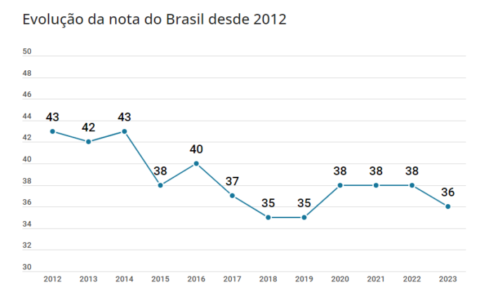 O ranking leva em conta dados de 13 fontes, que medem as impressões de empresários e especialistas sobre o nível de corrupção no setor público. A posição mais alta do Brasil foi alcançada em 2012, quando o país marcou 43 pontos e ficou em 69º lugar em uma lista com 176 países.