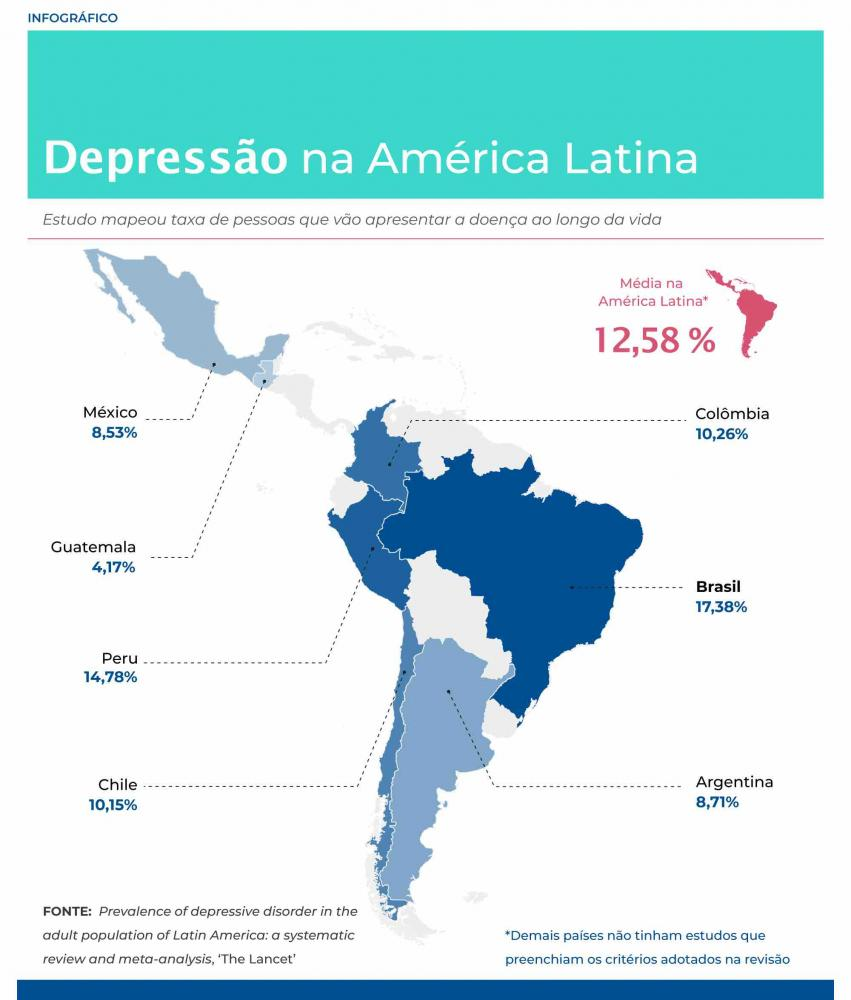 Em média, cerca de 12% das pessoas na América Latina apresentarão a doença ao longo da vida, enquanto no Brasil esse número chega a 17%. A taxa de diagnóstico nos últimos 30 dias é de 5,48% no Brasil e, no continente, de 3,12%. Nos últimos 12 meses, 8,11% dos brasileiros preencheram os critérios diagnósticos para a depressão, em comparação com 5,3% na América Latina. O número de brasileiros que atualmente sofrem com a doença está acima das estimativas da Organização Mundial da Saúde (OMS), que apontam para cerca de 5% dos adultos do mundo.