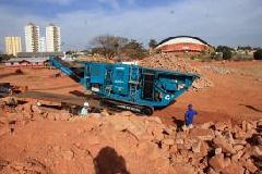 Já está no canteiro de obras da Arena Multiuso o britador móvel que vai reciclar aproximadamente 20 mil metros cúbico (m³) de concreto resultantes da demolição do antigo Verdão. Estes resíduos começam a ser britados nesta sexta-feira (30.07), trabalho que deve estar concluído em 60 dias. Segundo o engenheiro Marcelo Oliveira, que supervisiona a obra pela Agecopa, a chegada deste equipamento vai agilizar a conclusão do aterro de toda a área onde se situava o gramado e o fosso do antigo estádio.