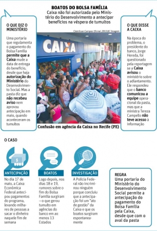 A Folha revelou que, um dia antes de o tumulto começar, em maio, a Caixa antecipou o pagamento do benefício sem avisar ninguém, alterando o calendário habitual e liberando de uma vez só o dinheiro dos beneficiários. Para a PF, esse foi um dos fatores que explicam os boatos.