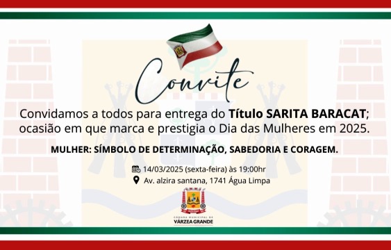 A Câmara Municipal de Várzea Grande, por meio de seu presidente, vereador Wanderley Cerqueira (MDB), tem a honra de convidar a todos para a Sessão Solene de entrega do Título “Sarita Baracat”. Este evento celebra e prestigia o Dia Internacional da Mulher em 2025.