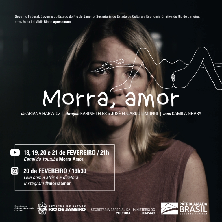 Depois de estrelar em outubro passado a websérie online “Morra, Amor“, adaptação do livro homônimo da escritora argentina Ariana Harwicz, a atriz Camila Nhary apresentaumaperformanceteatral, ao vivo e online, no dia 18 de fevereiro, às 21h, com a direção de Karine Teles e de José Eduardo Limongi. Contemplado pela Lei Aldir Blanc, o espetáculo, gratuito, será reprisado nos dias 19, 20 e 21, no mesmo horário pelo Instagram (@morraamor) e YouTube (bit.ly/2GzuN68). No dia 20, às 19h30, haverá uma live bate-papo com a atriz Camila Nhary e diretora Karine Teles pelas redes sociais, com participação do público. A última apresentação, no dia 21, será legendada para ser acessível a pessoas com deficiência auditiva.
