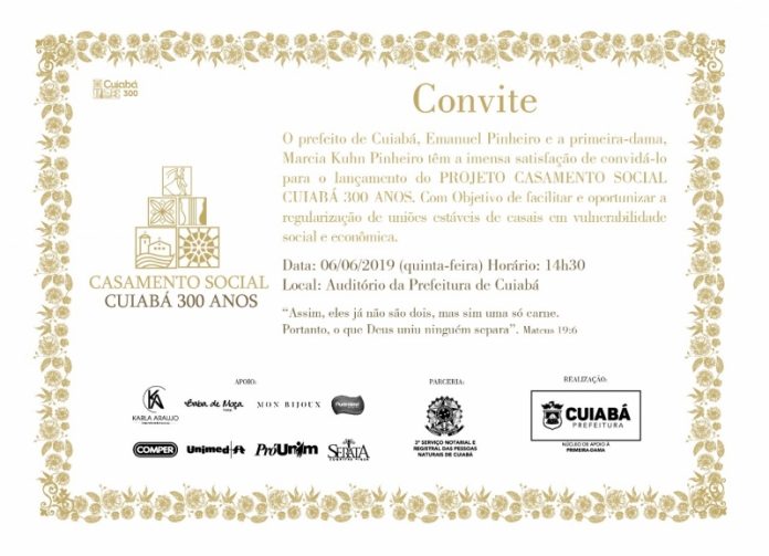 O prefeito Emanuel Pinheiro e a primeira-dama Márcia Pinheiro convidam para o lançamento do Casamento Social Cuiabá 300 anos, nesta quinta-feira (06), às 14h30, no auditório da Prefeitura de Cuiabá. Esse é mais um presente à população no aniversário do Tricentenário da Capital. Ao todo serão 300 casais que desejam regularizar o estado civil e não têm condições de arcar com as despesas financeiras.