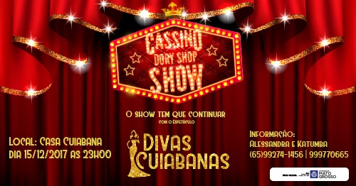 E, é nesta pegada que o “Cassino Dory Shop Shop”entra para marcar o retorno das “Divas Cuiabanas” que abrilhantaram as noites com suas performáticas luxuosas e, às vezes caricatas. O evento servirá para relembrar os tempos áureos os desfiles e concursos de Drag Queens e promover um grande encontro entre amigos saudosos, da época. Além de diversão garantida para o público. Na noite, será entregue o troféu “Diva Cuiabana” para algumas personalidades da época. Três performances confirmadas e desfile com concurso de fantasias. Nos pick-ups DJ Vasquinho vai animar a pista de dança.