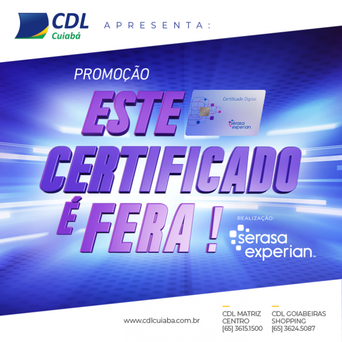 A Câmara de Dirigentes Lojistas (CDL Cuiabá), em parceria com a Serasa Experian, lançou recentemente a Campanha “Este Certificado É Fera!”. A Campanha da Serasa Experian consiste em uma promoção nacional para aqueles que emitirem ou renovarem o Certificado Digital de pessoas jurídicas ou físicas.