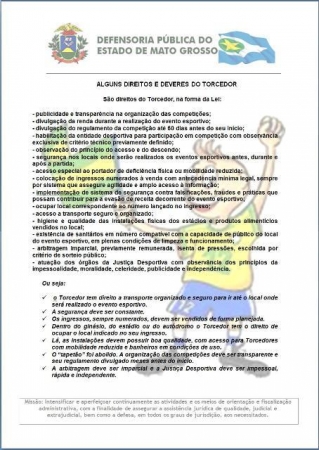 Com a missão constitucional de prestar assistência jurídica integral e gratuita aos cidadãos economicamente menos favorecidos, bem como orienta-los juridicamente, a Defensoria Pública do Estado elaborou um panfleto com direitos e deveres do torcedor, a fim de auxiliá-los durante a Copa do Mundo de 2014.