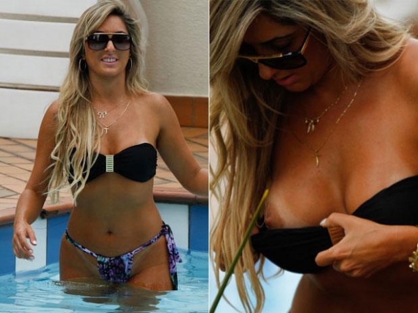 Eleita "musa da internet" após uma enquete promovida pela revista Vip, Aline Rodrigues foi fotografada em momentos particulares curtindo o sol à beira da piscina em São Paulo nesta quarta-feira (23). Colocando o bronzeado em dia, a modelo tomou sol, se refrescou na piscina e usou seu celular para tirar fotos. Ao arrumar o biquíni, a beldade acabou mostrando demais para o fotógrafo de plantão