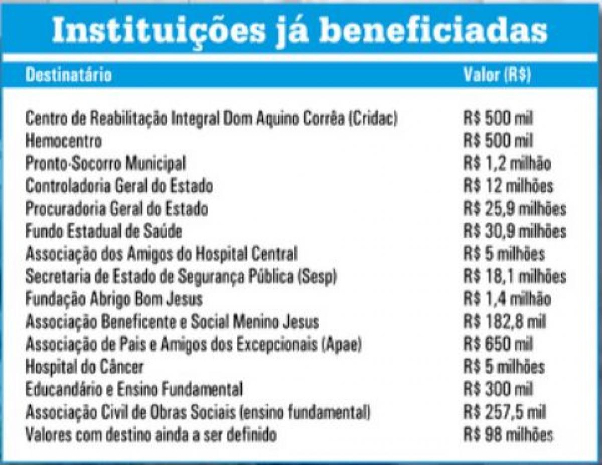 A maior parte deste recurso, cerca de R$ 89,5 milhões, foi e ainda está sendo destinada ao setor da Saúde. Foram beneficiados o Hemocentro, o Pronto-Socorro Municipal, o Fundo Estadual de Saúde e o Hospital Central, além de outras entidades beneficentes e filantrópicas. A Segurança Pública também foi privilegiada, a secretaria receberá aproximadamente R$ 18,1 milhões do dinheiro usurpado dos cofres do Estado.