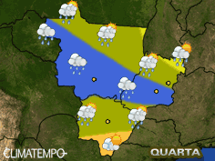 Na quinta-feira, o tempo fica instável, com várias pancadas de chuva que intercalam com aberturas de sol entre muitas nuvens em Mato Grosso do Sul, no norte de Goiás e na maior parte de Mato Grosso. Nas outras áreas de Goiás, no Distrito Federal e no sudoeste de Mato Grosso, o céu fica nublado e chove a qualquer hora do dia. Há risco de chuva forte.