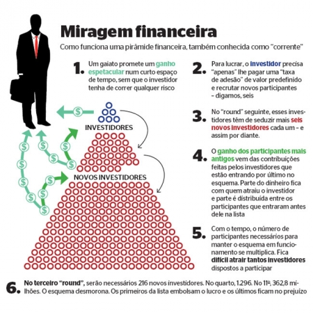 Conforme a Senacon, os pontos de destaque das pirâmides são: as vendas efetuadas de modo desproporcional, a pouca informação sobre a empresa e as chances de ganhos exagerados. Marco Antonio Araujo Junior, advogado e presidente da Comissão de Direito do Consumidor da Ordem dos Advogados do Brasil (OAB) de São Paulo, diz que ao ouvir uma proposta de investimento muito melhor do que as tradicionais é preciso "ligar" um sinal de alerta.>