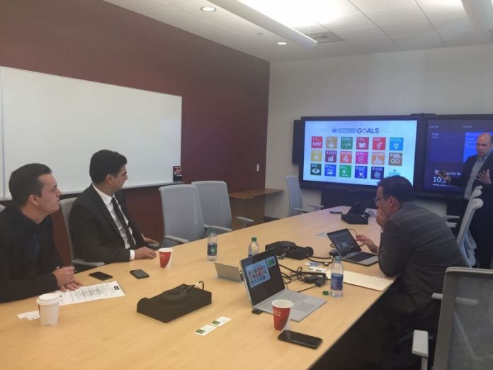 Os secretários de Educação, Rafael Cotrim, e o extraordinário Cuiabá 300, Júnior Leite, participam da reunião com o representante da multinacional. O convênio no valor estimado de R$ 13 milhões foi um dos resultados da viagem do prefeito aos Estados Unidos.