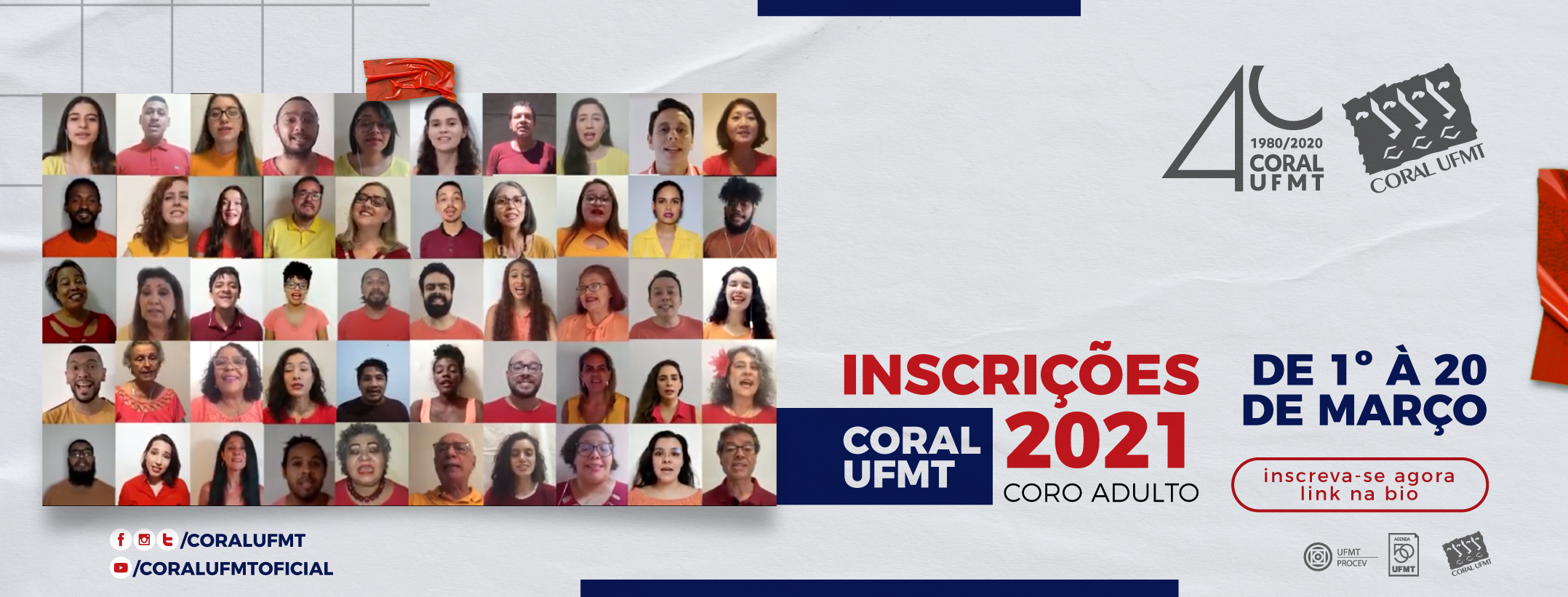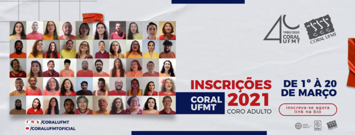 As inscrições da temporada 2021 para novos coralistas ingressarem no Coral UFMT já estão abertas. A novidade para este ano é a possibilidade de pessoas de qualquer município de Mato Grosso ou de outros estados participarem do grupo adulto. Esta opção só valerá enquanto durar a pandemia do novo coronavírus, uma vez que os ensaios ocorrem de forma on-line. Os interessados poderão se inscrever entre os dias 1º e 20 de março no link: http://bit.ly/3aSBGf0.