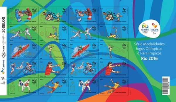 Marcando um ano para a abertura dos Jogos Olímpicos e Paralímpicos Rio 2016, os Correios lançam nesta quinta-feira (6), a segunda emissão especial “Série Modalidades Jogos Olímpicos e Paralímpicos Rio 2016”. A folha é composta por 20 selos que retratam nove esportes Olímpicos e um Paralímpico: boxe, canoagem, esgrima, futebol, golfe, handebol, taekwondo, tênis de mesa, triatlo e judô paralímpico.