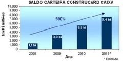 A Caixa Econômica Federal deve atingir a marca de R$ 7,4 bilhões em créditos na linha de financiamento Construcard em 2011. Esse montante representa um crescimento de quase 35% em relação ao ano de 2010 e é seis vezes maior que o saldo em 2008 – ou seja, crescimento de 500% nos últimos três anos.