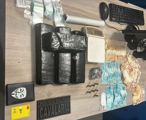 Os policiais iniciaram procedimento de abordagem e encontraram o suspeito. Na revista pessoal e vistoria no veículo, os militares localizaram a quantia de R$ 6.317,00 em dinheiro e porções de maconha e cocaína. Questionado pela PM, o suspeito afirmou ser integrante de uma facção criminosa responsável pela distribuição de drogas e recolhimento do dinheiro proveniente do tráfico de entorpecentes.