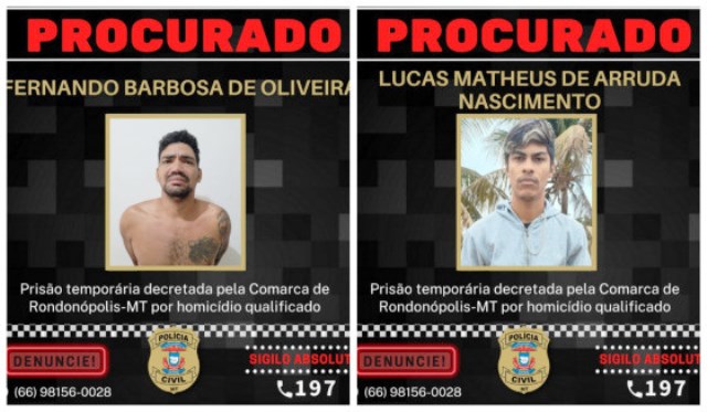 De acordo com as autoridades, os dois estão com mandados de prisões temporárias decretados pela 1º Vara Criminal da Comarca de Rondonópolis, depois de serem identificados como participantes da execução do jovem Henrique Ferreira Fontoura Martins, de 24 anos.