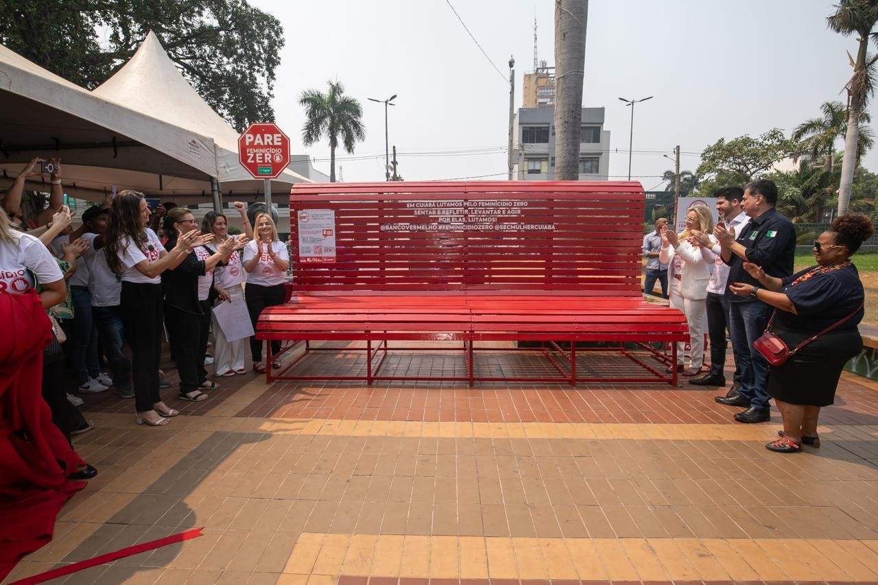 A Prefeitura de Cuiabá, por meio das Secretarias Municipal da Mulher e de Mobilidade Urbana (Semob), e em parceria com o Instituto Banco Vermelho (IBV), está implementando uma iniciativa pioneira no combate à violência contra a mulher e ao feminicídio. Frente às ações, está a primeira-dama de Cuiabá, Márcia Pinheiro. Além da instalação de dez bancos vermelhos (medindo quatro metros) em praças da cidade, 30 placas de sinalização, também na cor vermelha, foram fixadas em pontos estratégicos da capital.