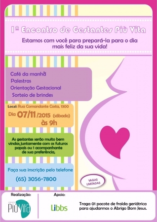 O valor da inscrição é um pacote de fralda geriátrica, que será doado ao Abrigo Bom Jesus de Cuiabá e dá direito a presença do papai ou de um acompanhante junto com a gestante. As vagas são limitadas para 80 gestantes.