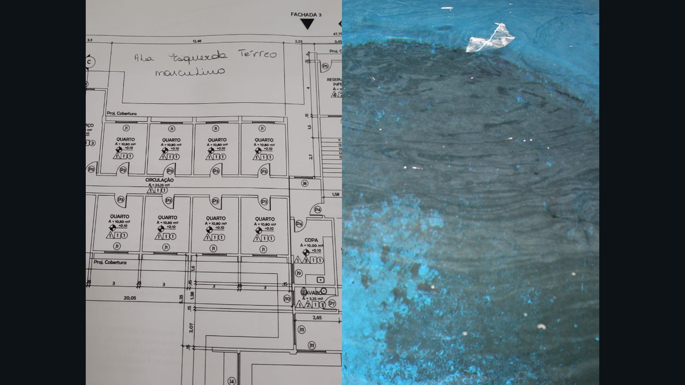 Imagens da planta baixa superior da CEU campus Cuiabá e da caixa d’água aberta e suja