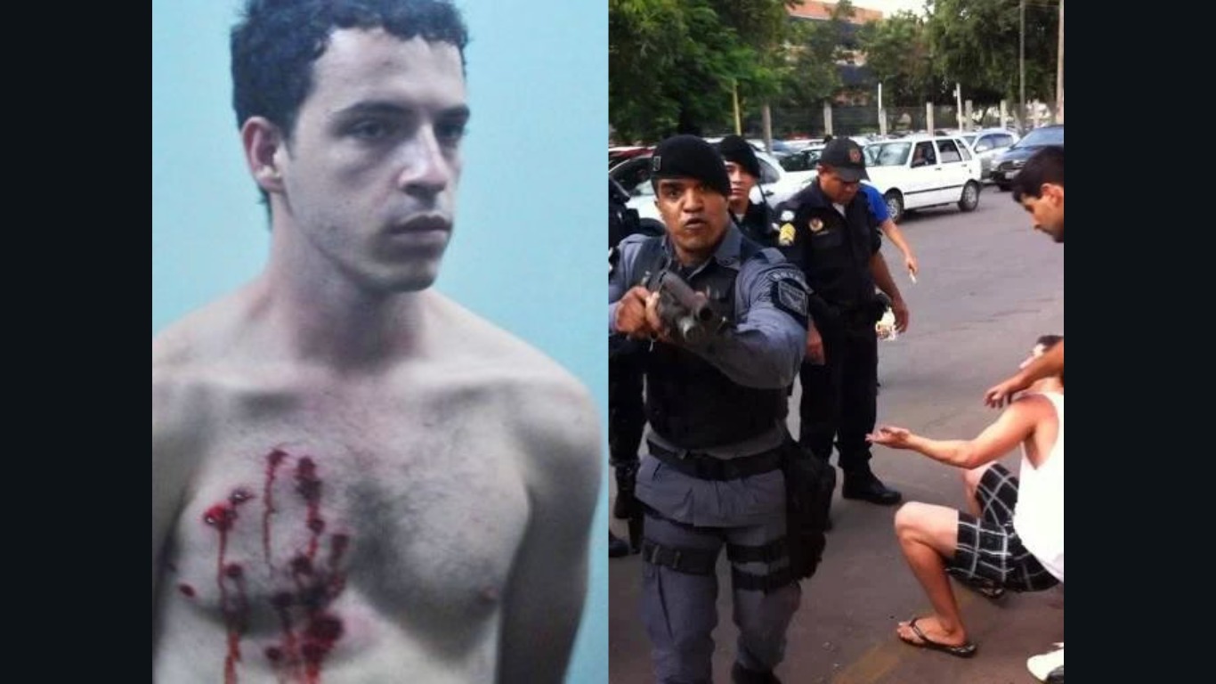 Caiubi Kuhn, então estudante da UFMT e hoje professor da mesma instituição, foi um dos atingidos durante o protesto contra o fechamento de 50 vagas na CEU em 2013. É ele quem aparece ferido na imagem acima; ao lado, uma demonstração de como os policiais estavam agindo contra os estudantes