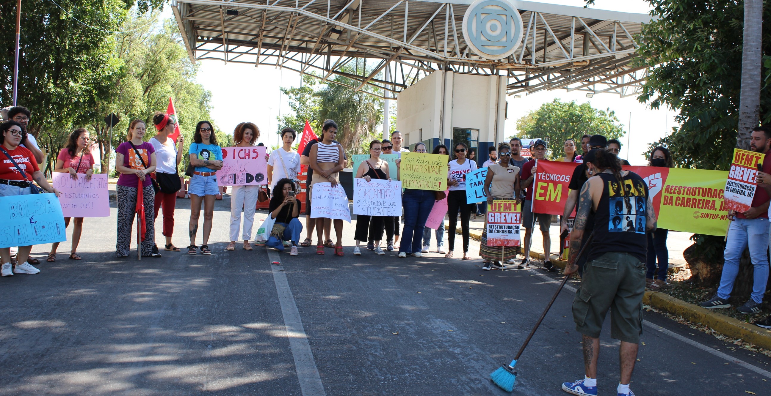 Estudantes protestam contra a retirada de R$ 2 milhões da Assistência Estudantil em 2023; mesmo assim, o Conselho de Ensino, Pesquisa e Extensão da UFMT aprovou o redirecionamento do recurso para os contratos com as empresas que administravam os Restaurantes Universitários