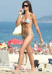 A modelo exibiu seus 90 cm de busto, 90 cm de quadril e 57 quilos distribuídos em 1,78 m em um pequeno biquíni estampado.