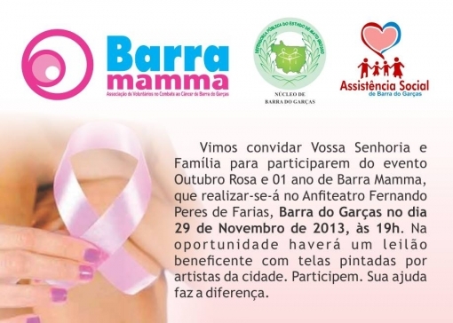 A Defensoria Pública de Barra do Garças, em parceria com a Associação de Voluntários no Combate ao Câncer (Barra Mama) e a Secretaria de Assistência Social do Município, realiza no dia 29 de novembro evento beneficente com o objetivo de comemorar 1 ano da Associação e também o sucesso do projeto "Outubro Rosa", além de angariar fundos para a entidade filantrópica e divulgar a cultura no Município.