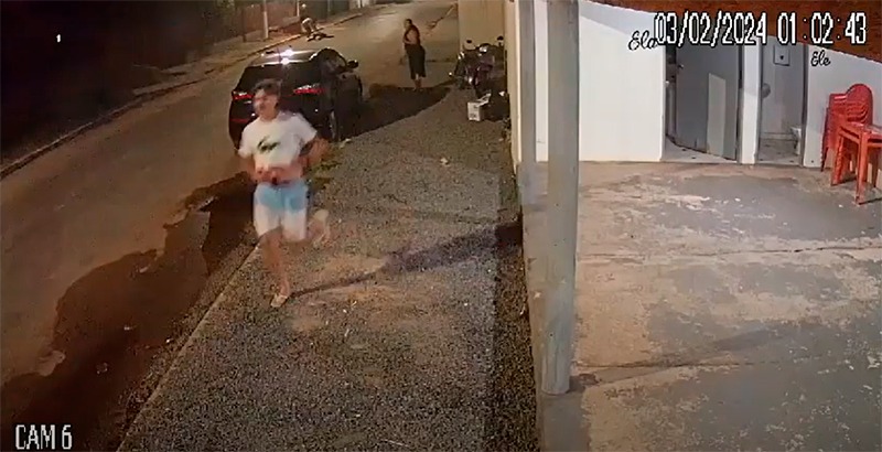 Num vídeo (abaixo) gravado por câmeras de segurança, é possível ver um homem de camisa branca correndo e guardando “uma arma” na cintura após o atropelamento.