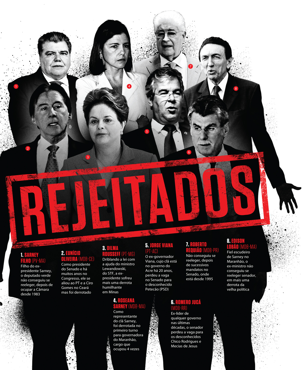 A lista de políticos derrotados é grande e suprapartidária. Inclui nomes como Jorge Viana (PT-AC), Roberto Requião (MDB-PR), Magno Malta (PR-ES), Cássio Cunha Lima (PSDB-PB), Vanessa Grazziotin (PCdoB-AM), Roberto Freire (PPS-SP). E Romero Jucá (MDB-RR) que se eternizou no Senado ao ocupar o cargo eterno de líder do governo. Fosse ele qual fosse, de FHC a Lula. Jucá não foi reeleito.