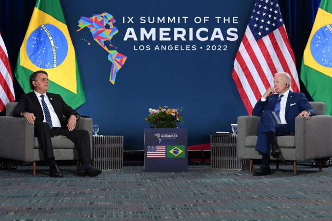 O presidente do Brasil, Jair Bolsonaro (PL), se reuniu na noite desta quinta, 9, com o presidente dos Estados Unidos, Joe Biden, durante a Cúpula das Américas que está acontecendo em Los Angeles. Durante a parte do encontro bilateral que pode ser acompanhada por jornalistas, os dois comentaram sobre diversos assuntos, como as eleições no Brasil e a guerra na Ucrânia. Ambos ressaltaram a amizade entre os dois países, e disseram ter valores em comum, como a defesa da liberdade e da democracia. Biden citou a preservação da Amazônia e disse que o Brasil deve ter ajuda internacional no financiamento para preservá-la; Bolsonaro afirmou que o Brasil preserva cerca de 2/3 de seu território.