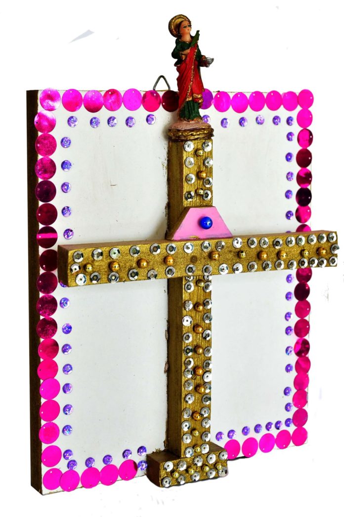 Durante todo o tempo produziu flâmulas de santos e cruzes em madeira com detalhes em pedrarias. “Tinha dias que chegava a produzir até três. E enquanto eu ia fazendo, ia orando. Antes de dormir, pedia inspiração para o dia seguinte e muita coisa vinha até em sonho. No dia seguinte, replicava”, conta.