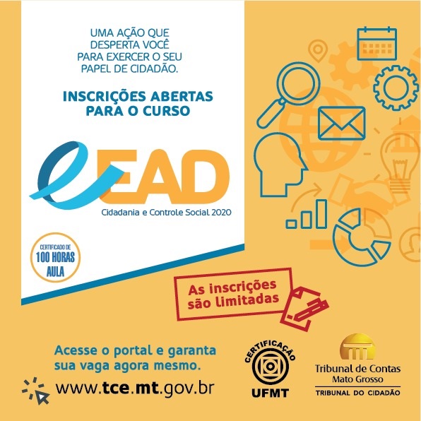 O Tribunal de Contas de Mato Grosso (TCE-MT) deu início as inscrições da 7ª edição do Curso de Extensão, via Ensino a Distância (EaD), cujo tema será “Cidadania e Controle Social”. Com mil vagas disponíveis, o curso será realizado de 4 de maio a 20 de julho, com certificação de 100 horas/aula pela Universidade Federal de Mato Grosso (UFMT).