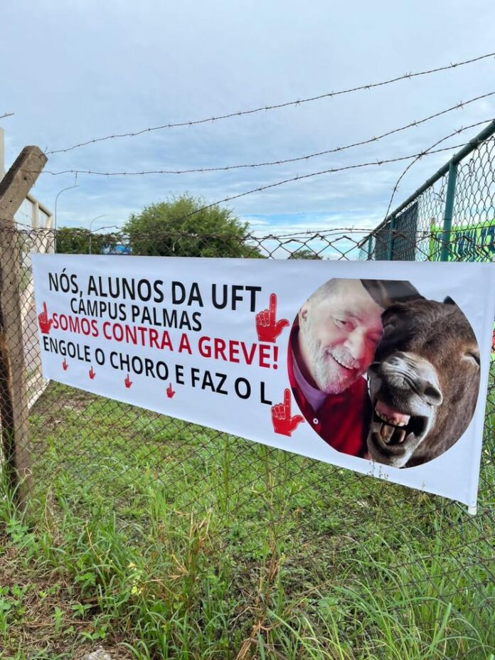 “Nós, alunos da UFT Campus Palmas, somos contra a greve. Engole o Choro e faz o L”, declarava a faixa, que incluía uma imagem do presidente Lula ao lado de um burro.