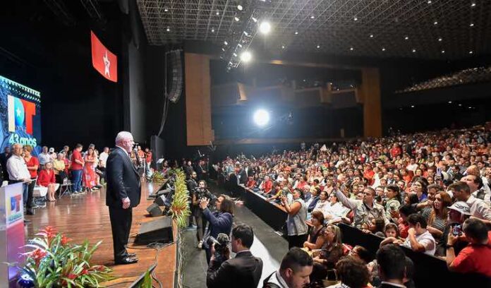 Lula celebrou a história do partido que ajudou a fundar, lembrando que é uma das maiores organizações de esquerda do planeta. O ex-presidente incentivou os membros do partido a contribuírem para que o PT não fique eternamente dependente de fiscalização do Tribunal de Contas da União (TCU), declarando que “temos que ter recursos próprios, e recursos próprios é contribuição dada por nós”.