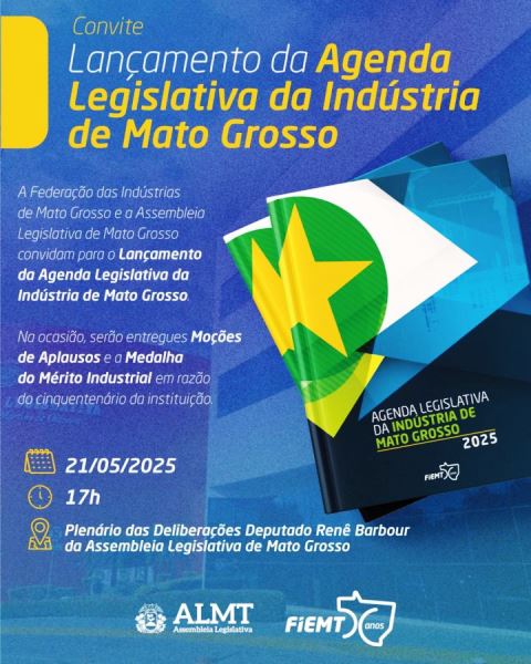 A Federação das Indústrias de Mato Grosso (Fiemt), que acompanha diariamente os projetos de interesse do setor industrial que estão em tramitação na Assembleia Legislativa de Mato Grosso, lança na quarta-feira (21.05), às 17h, a Agenda Legislativa da Indústria. A sessão solene foi proposta pelo presidente da ALMT, Max Russi, com o apoio do deputado Carlos Avallone.