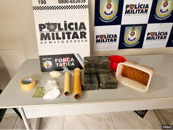 Policiais militares da Força Tática do 1º Comando Regional prenderam em flagrante uma mulher de 59 anos por tráfico ilícito de drogas, nesta terça-feira (16.04), em Cuiabá. Com a suspeita, a PM apreendeu quatro tabletes de pasta base de cocaína e materiais para fabricação e venda dos entorpecentes.