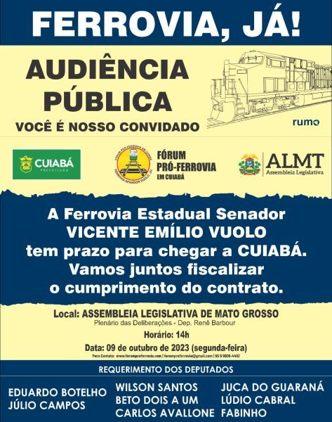 No dia 09 de outubro, às 14h, será realizada uma audiência pública na Assembleia Legislativa para tratar sobre o projeto da Ferrovia Senador Emílio Vicente Vuolo. O requerimento, apresentado por oito deputados, foi aprovado por unanimidade e o evento será realizado em conjunto com o Fórum Pró-Ferrovia e a Prefeitura de Cuiabá, no plenário das deliberações da Assembleia.