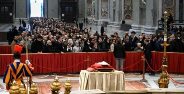 Corpo já foi – como manda a tradição – colocado em caixão de cipreste forrado com veludo vermelho e ainda será inserido em outros dois antes do sepultamento; missa fúnebre é conduzida pelo Papa Francisco